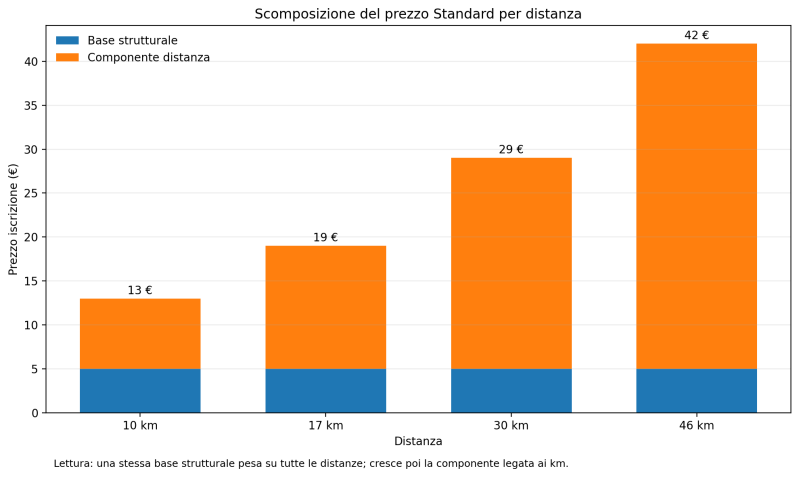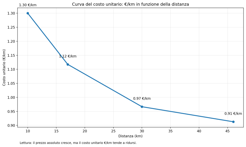 il prezzo assoluto cresce con la distanza, ma il costo unitario €/km tende a ridursi.
